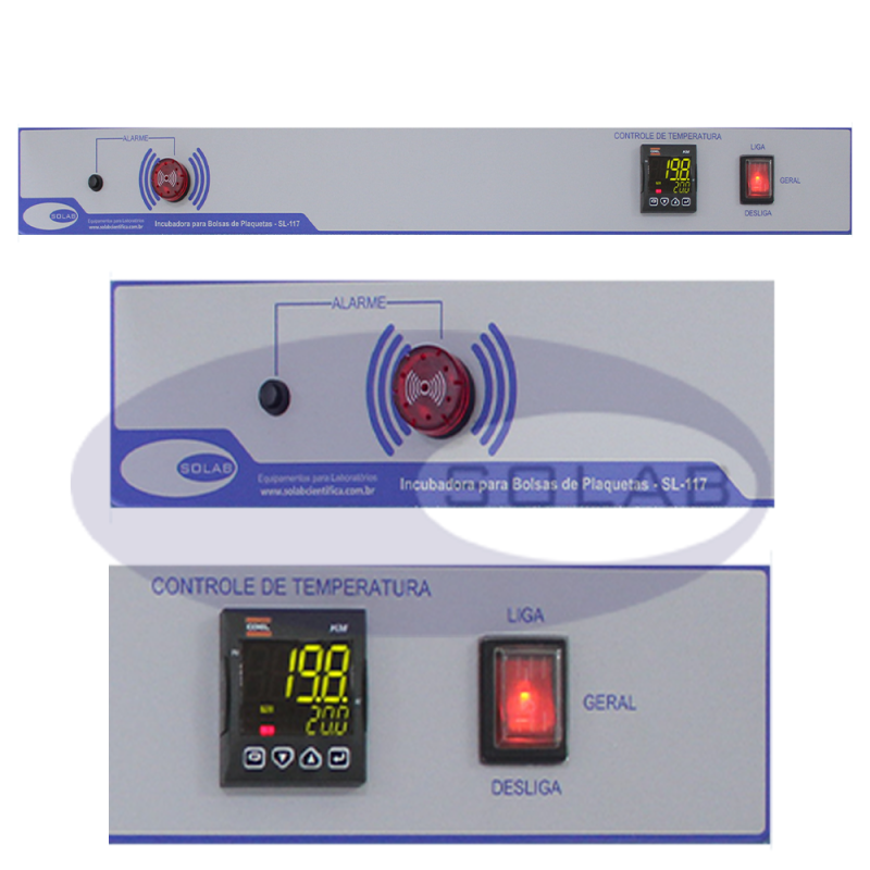- Alarme sonoro e visual para falta de energia e temperaturas alta e baixa;